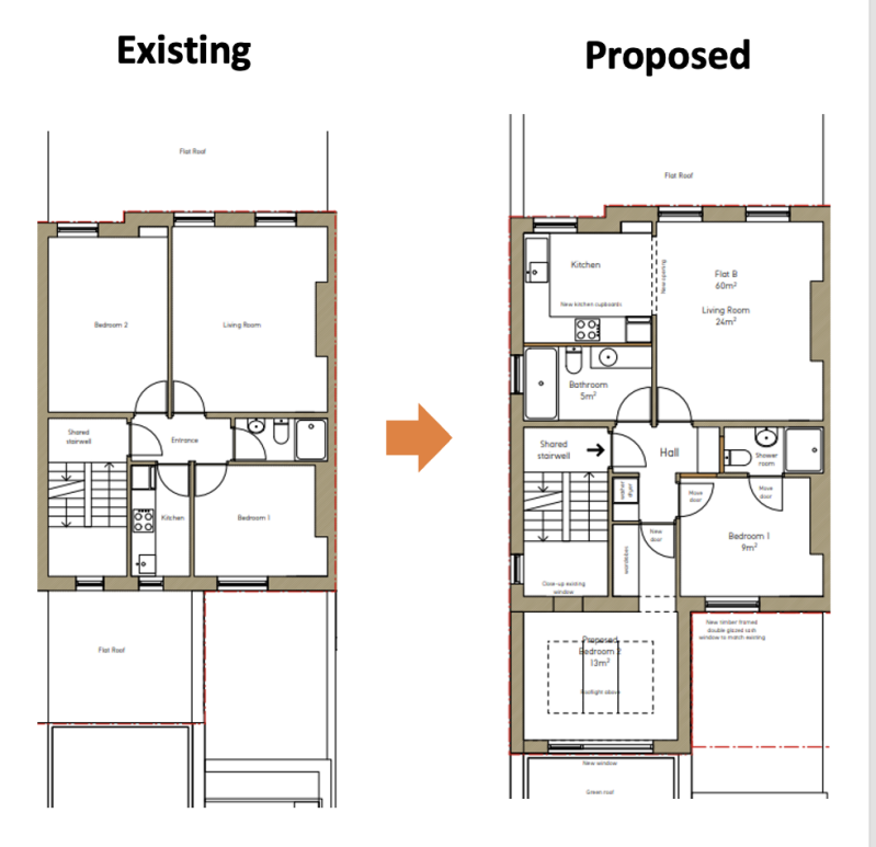 - Planning submitted for the creation of 3 new 38 sqm self contained studio flats and the erection of privacy screens around the resultant flat roof at third floor level to the rear elevation in connection with its use as a terrace.